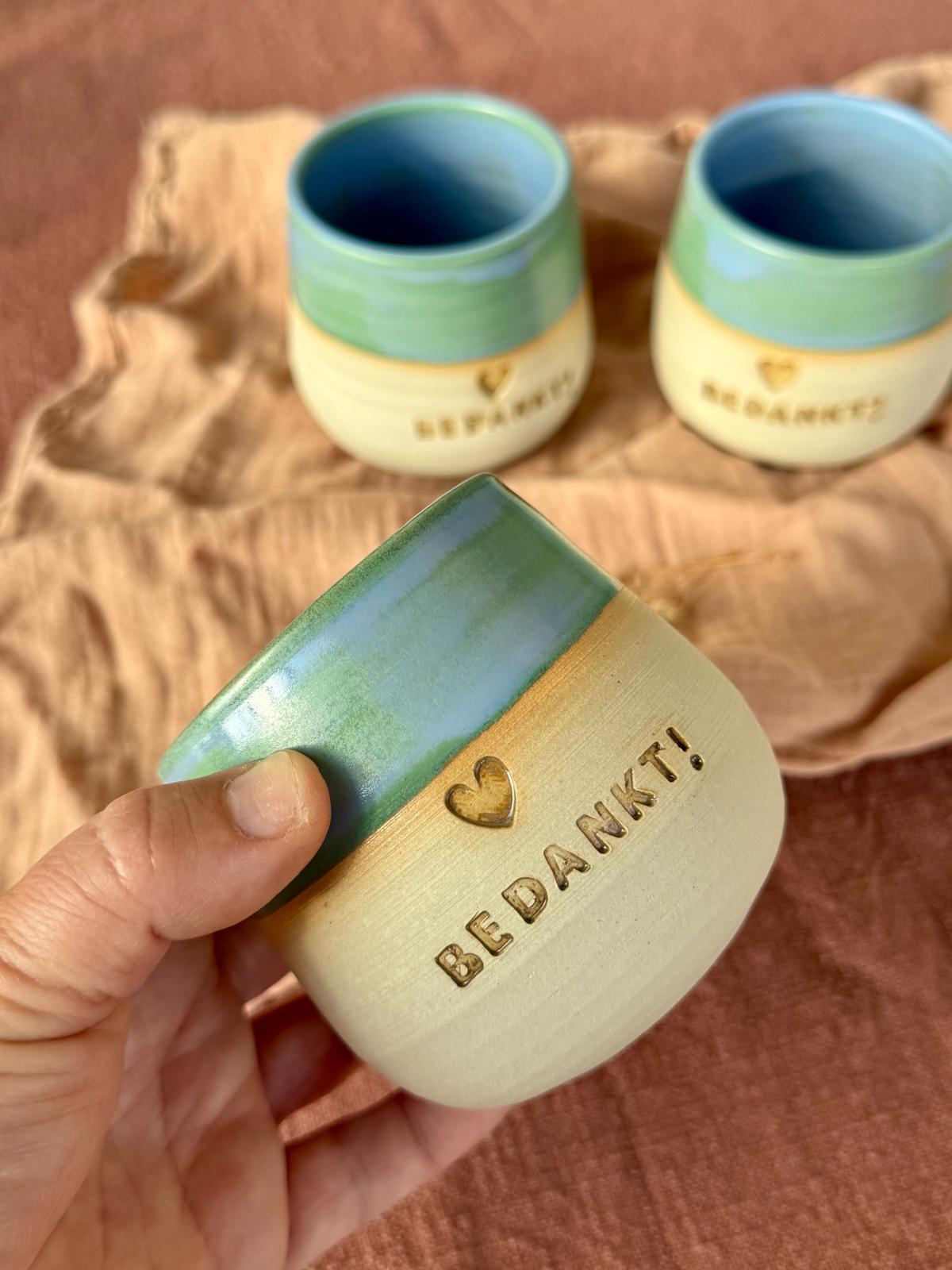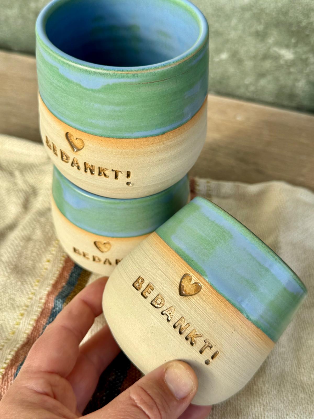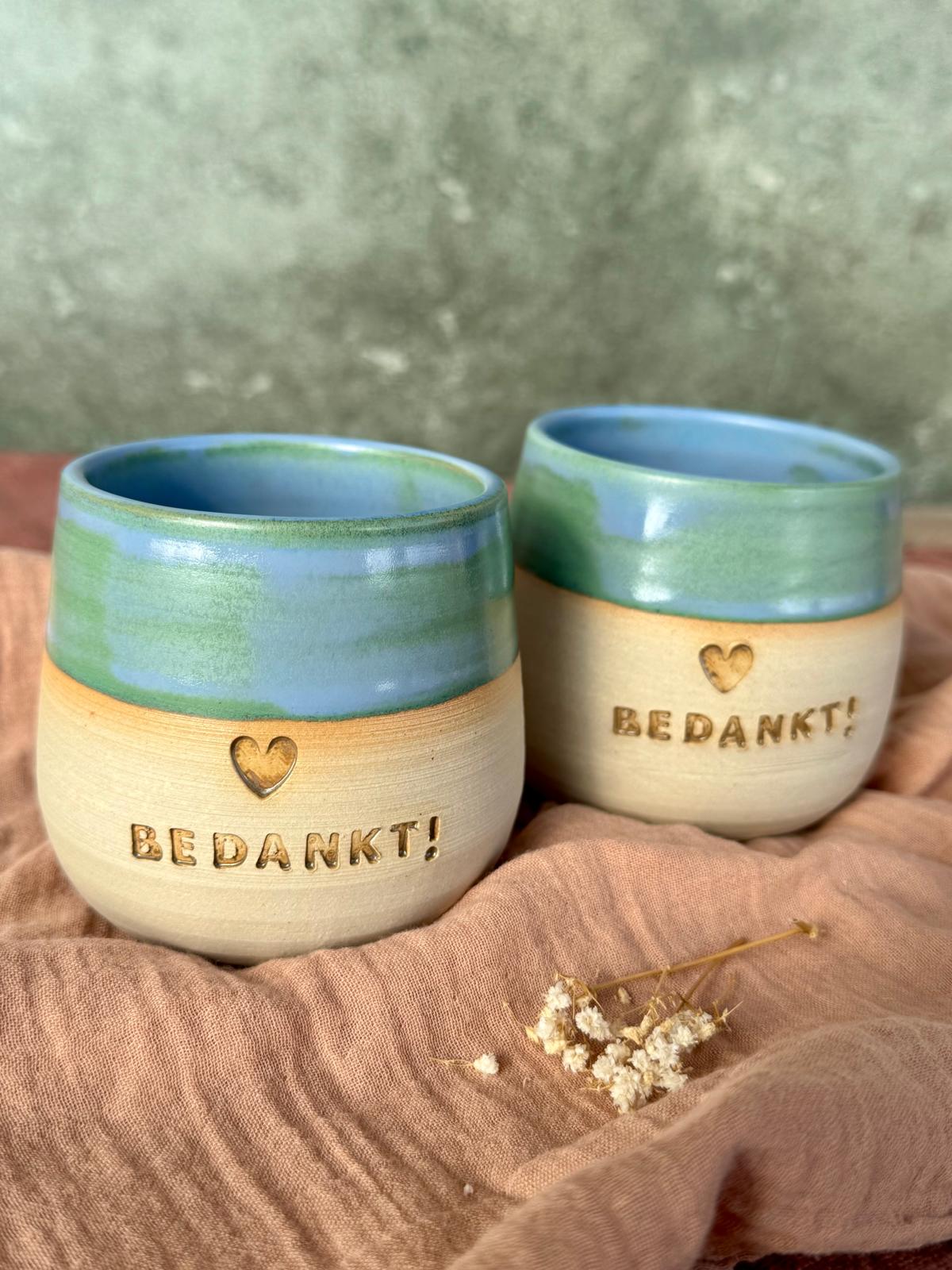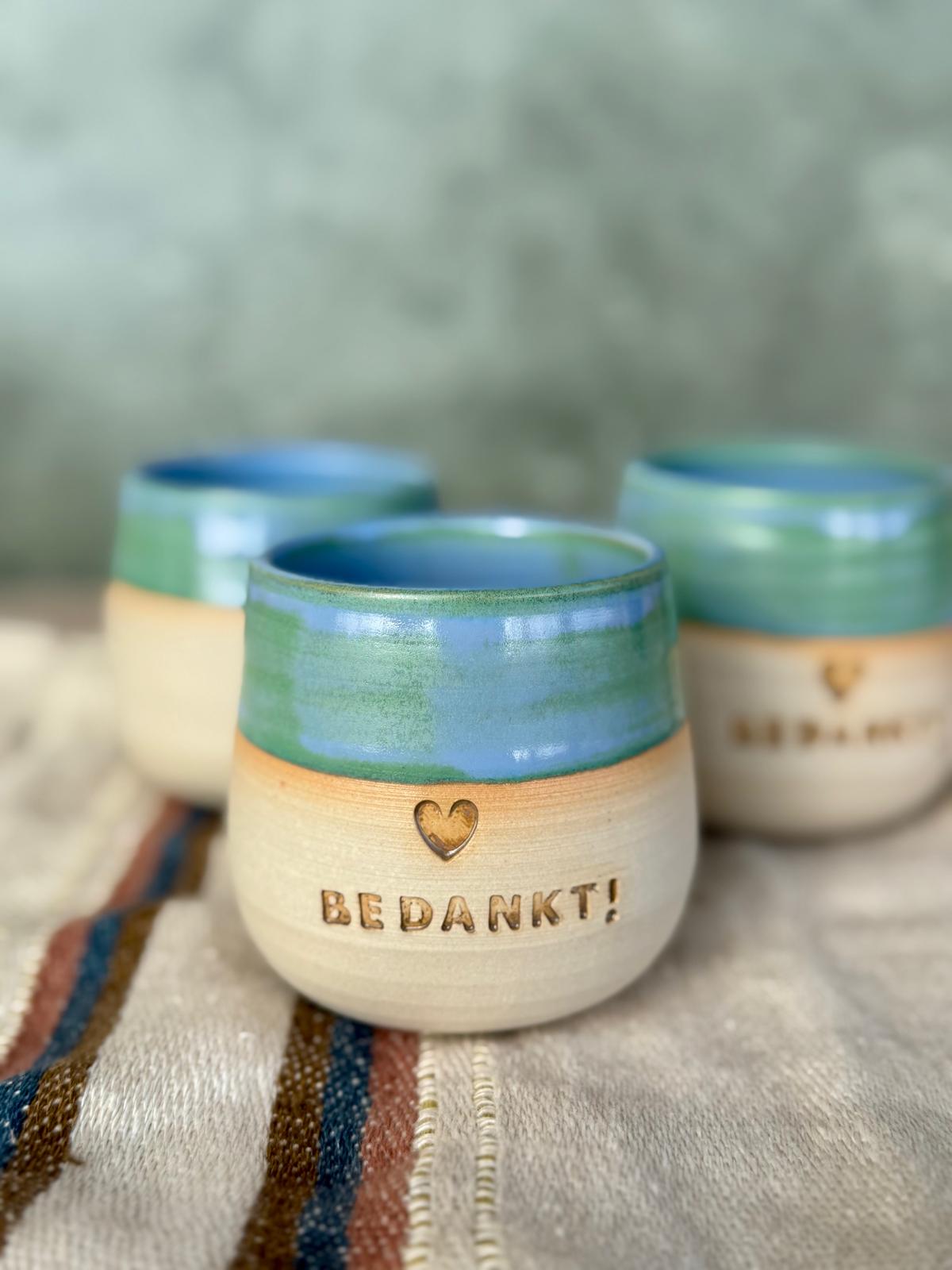 Mok in middenblauw met groene zweem erin en tekst BEDANKT