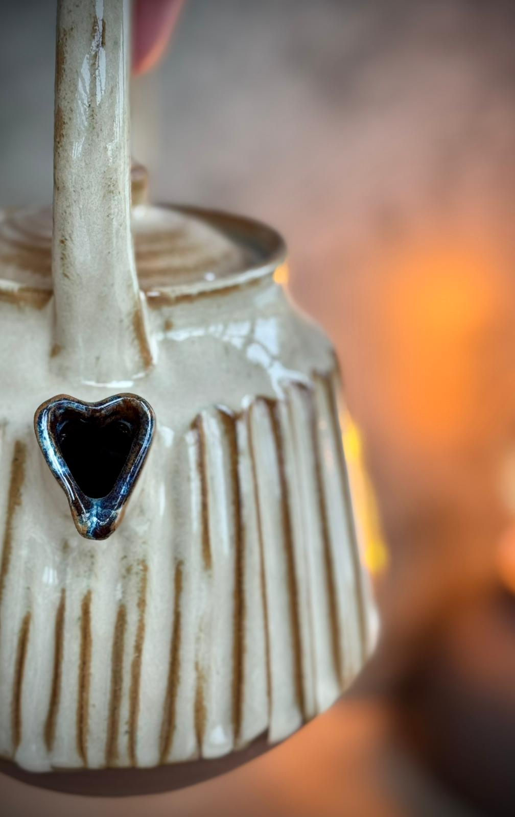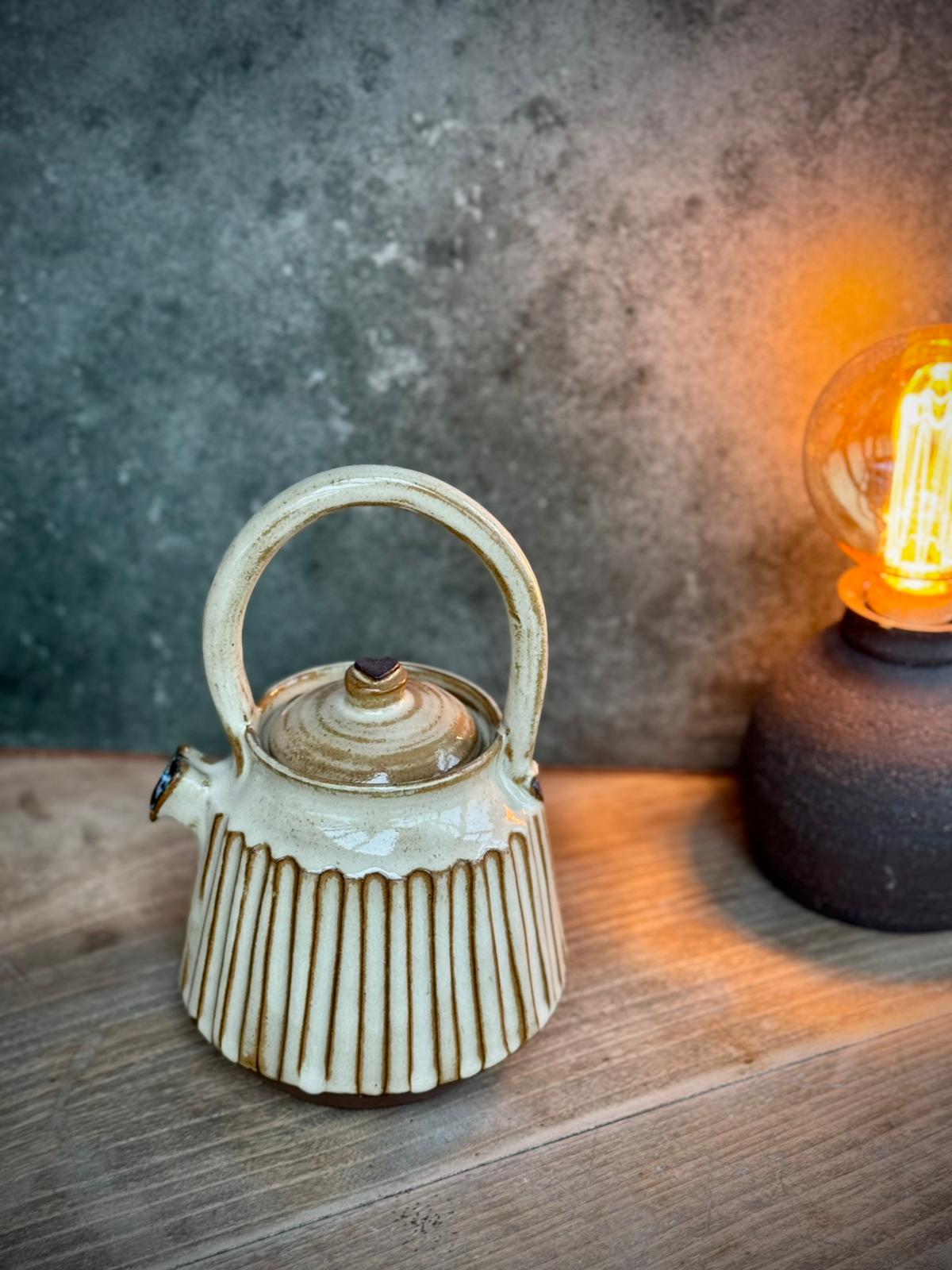 Theepot gedraaid in bordeauxklei en afgewerkt met warm beige glazuur.