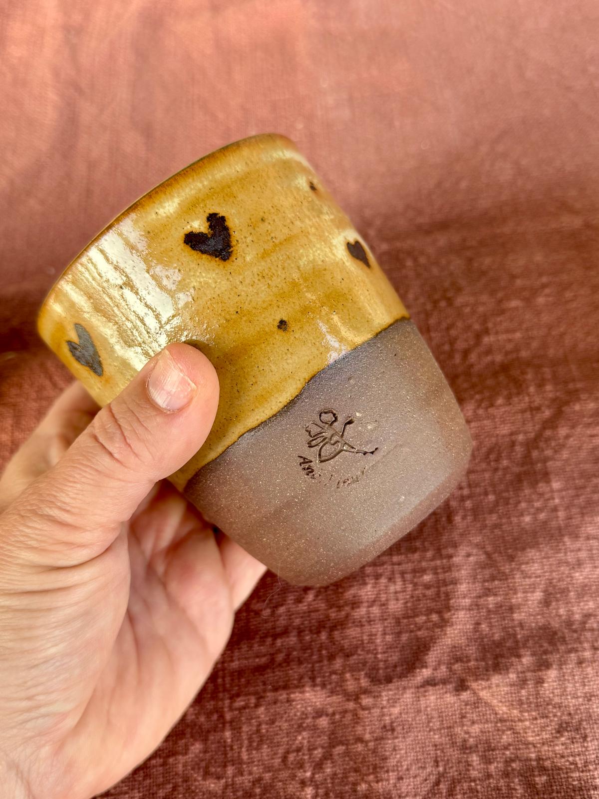 Ruime tassen, gemaakt uit Belgische, bordeaux klei en heel warm lichtbruin/ donker ecru glazuur