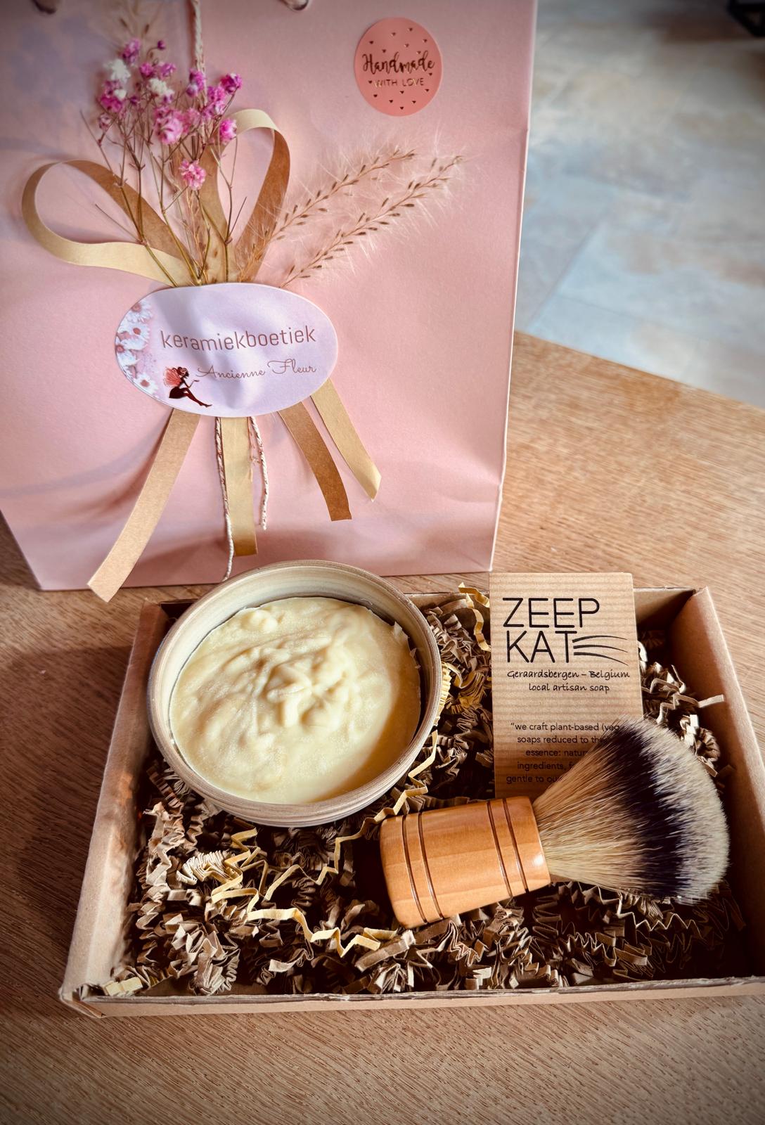 Het setje bestaat uit een elegant handgedraaide kom gevuld met de natuurlijke zeep van Zeepkat, en inclusief ook een prachtige, 100% vegan zeepborstel.