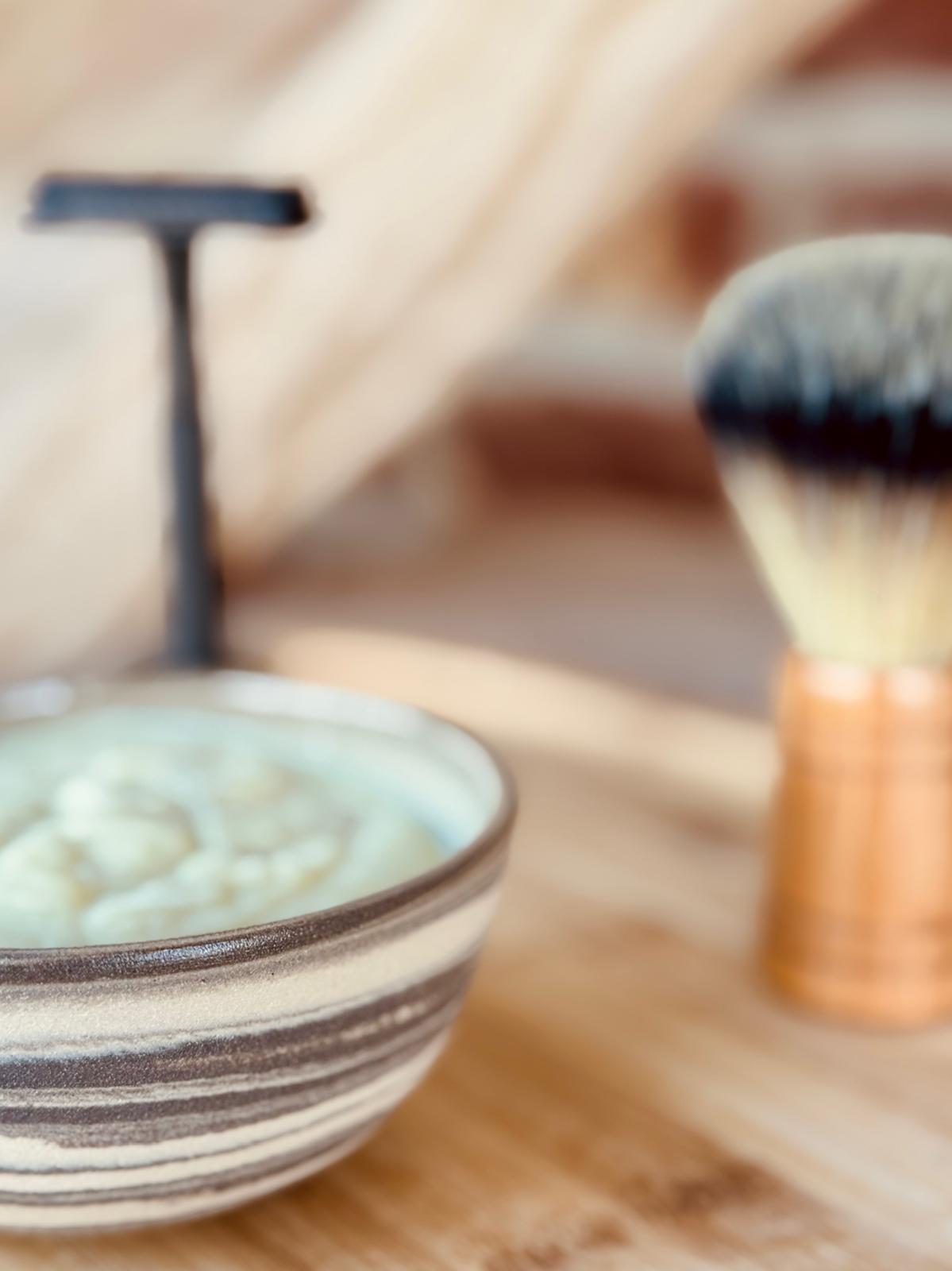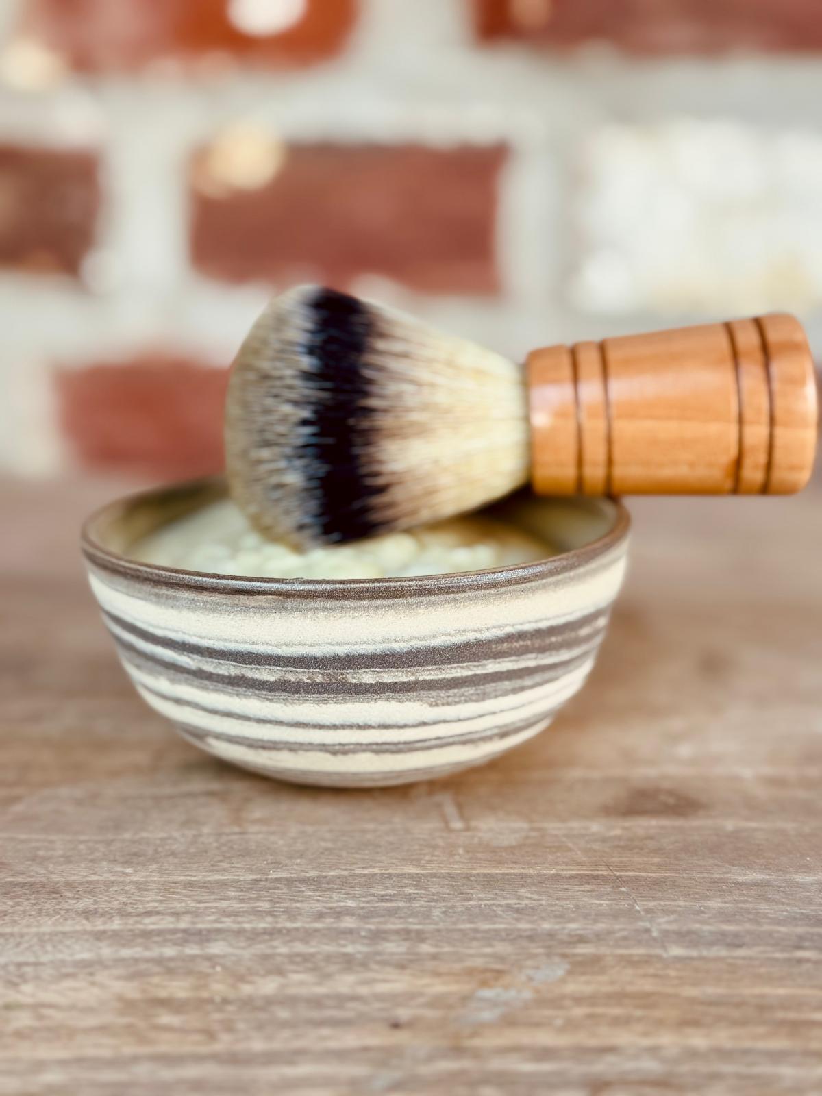 Het keramiekkommetje werd handgedraaid met 2 soorten klei, waardoor er een prachtige natuurlijke speling is van antraciet en beige. Ieder potje is anders van tekening en dus superuniek. Daarenboven matchen de kleuren van de zeepborstel en kom prachtig!