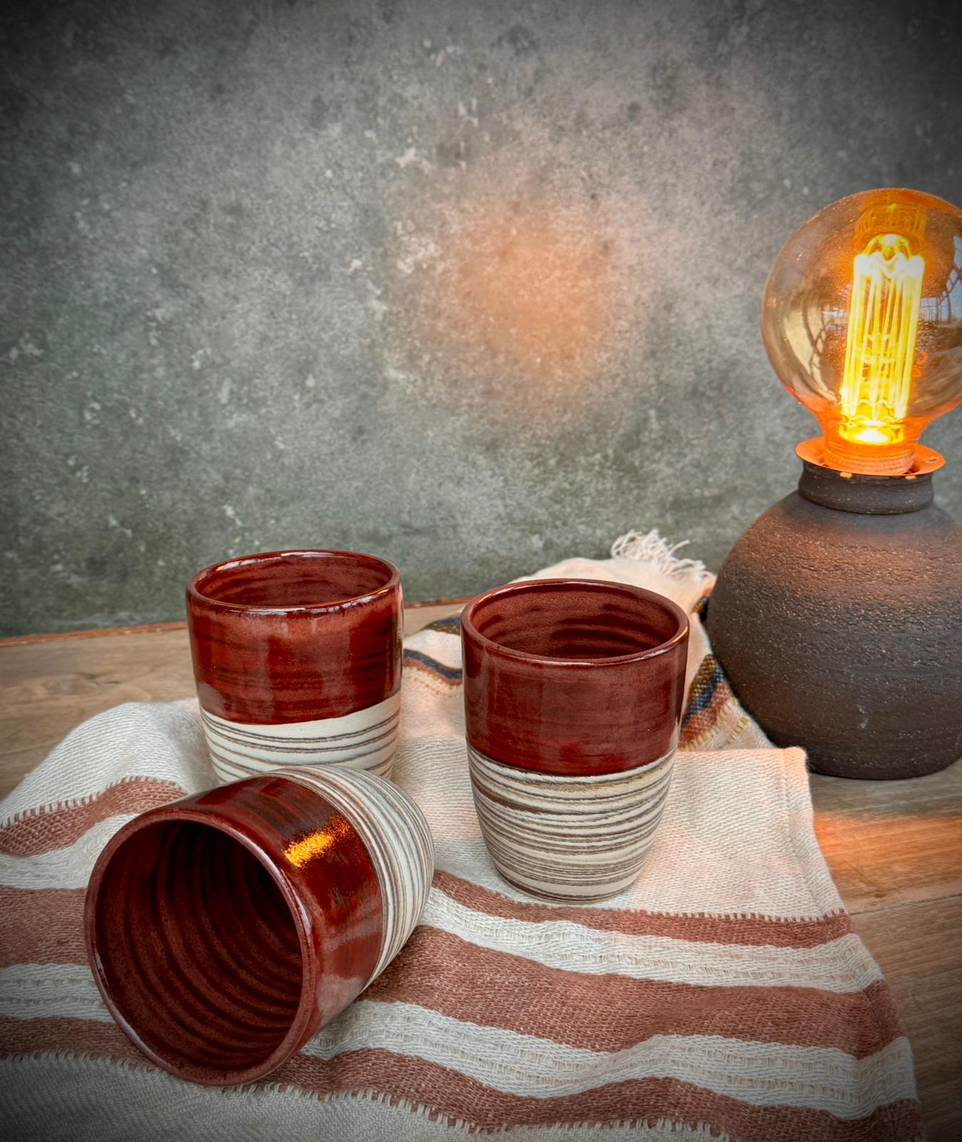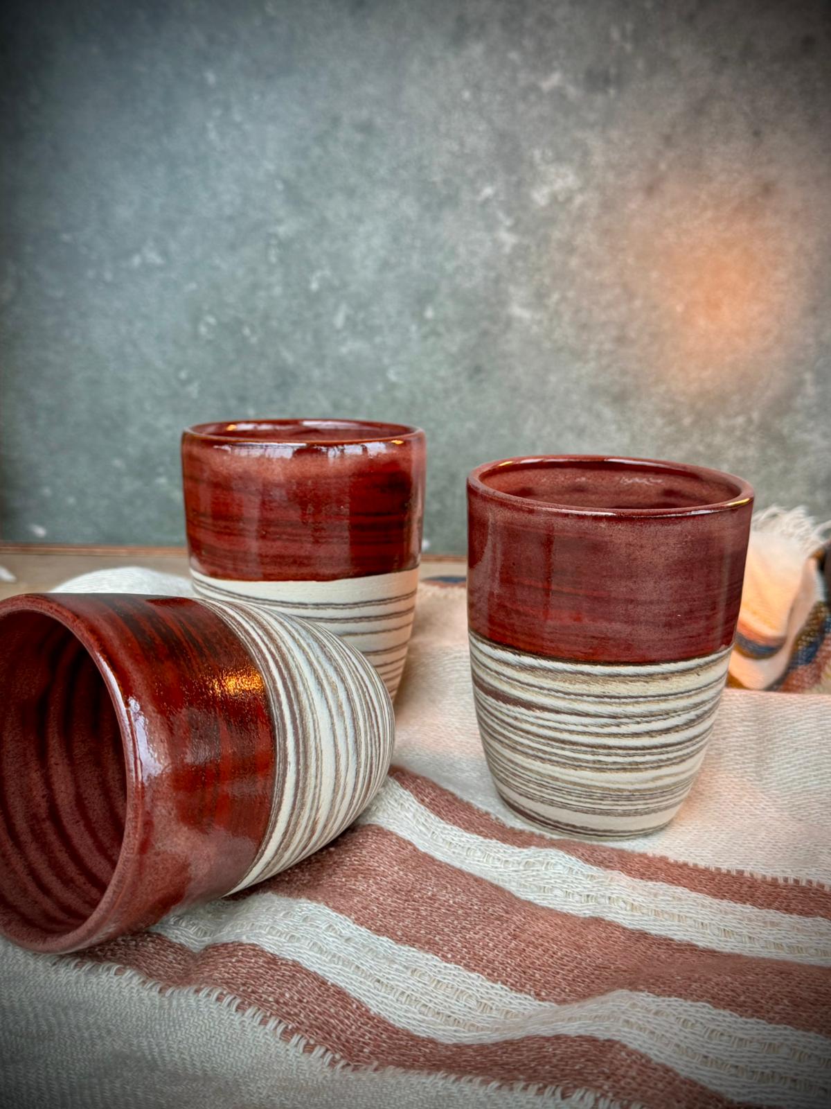 Gedraaid in rood en beige klei met warm aards rood glazuur