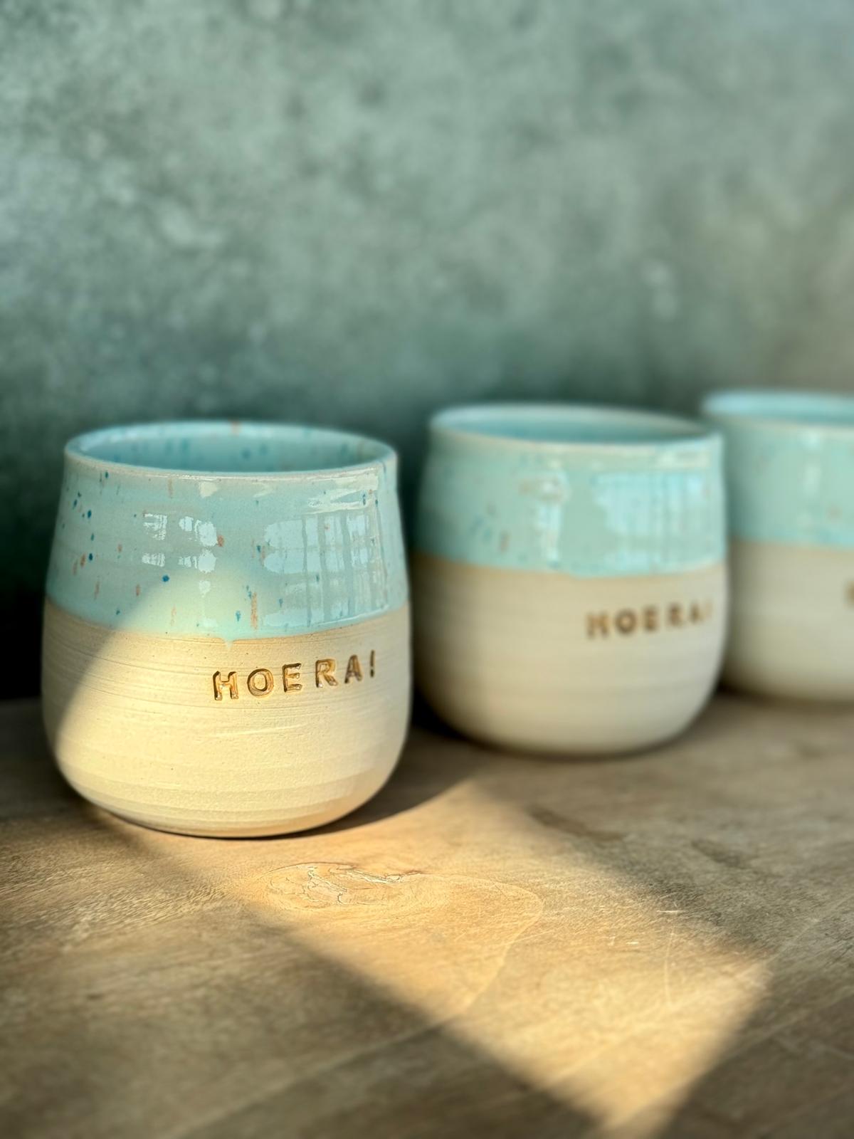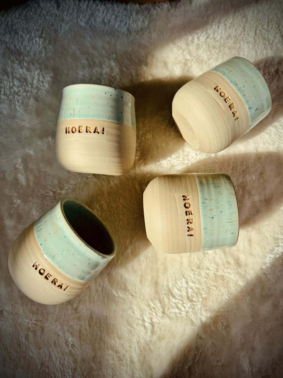 Deze vrolijke tassen hebben een licht turquoise glazuur met kleine stookjes, lijkt wel een beetje op confetti :)