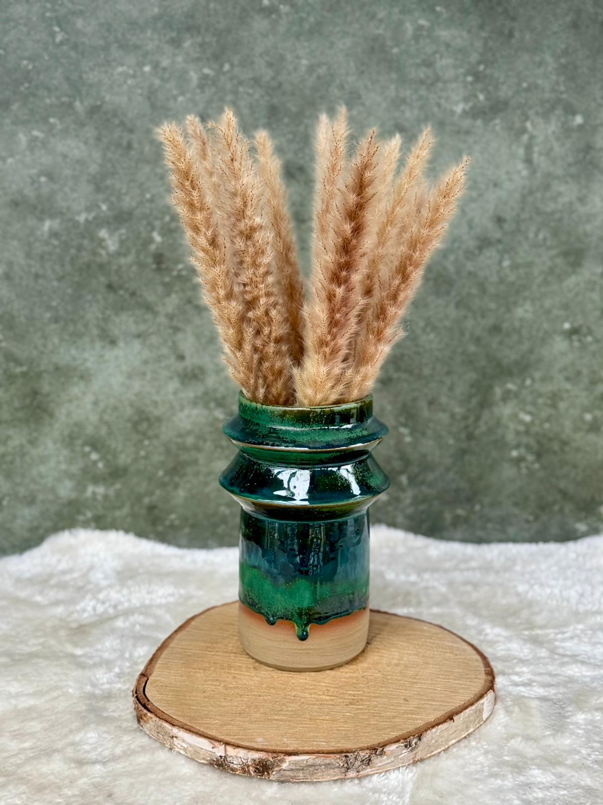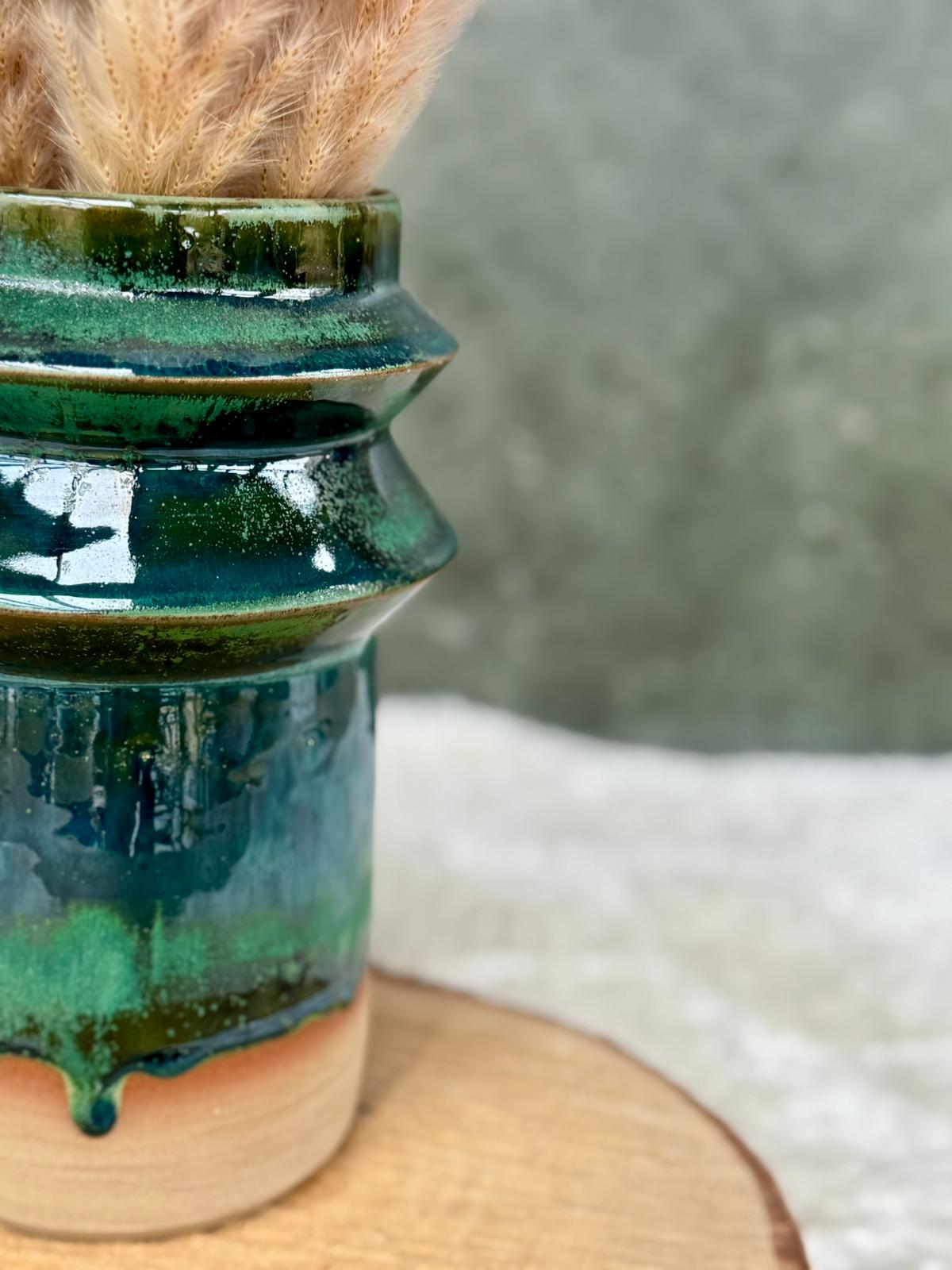 Cilindervaas, perfect voor elk boeket, afgewerkt in zeer glimmende variaties van groen glazuur.