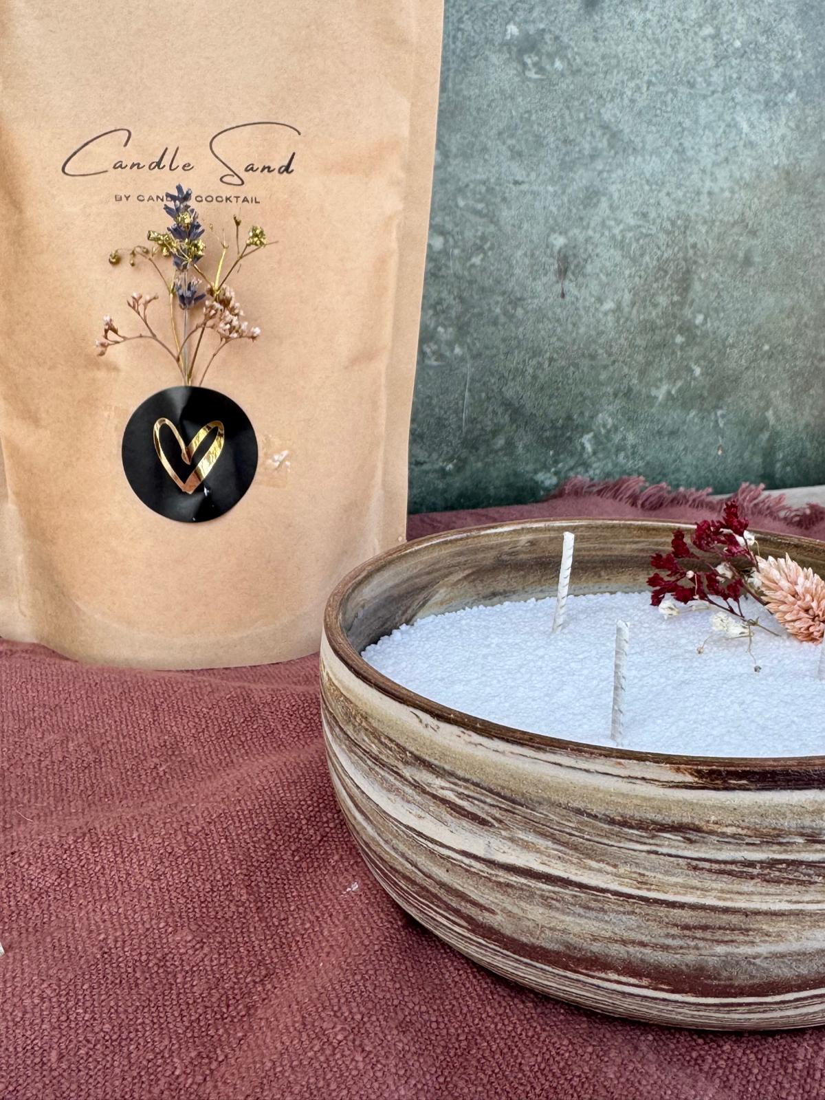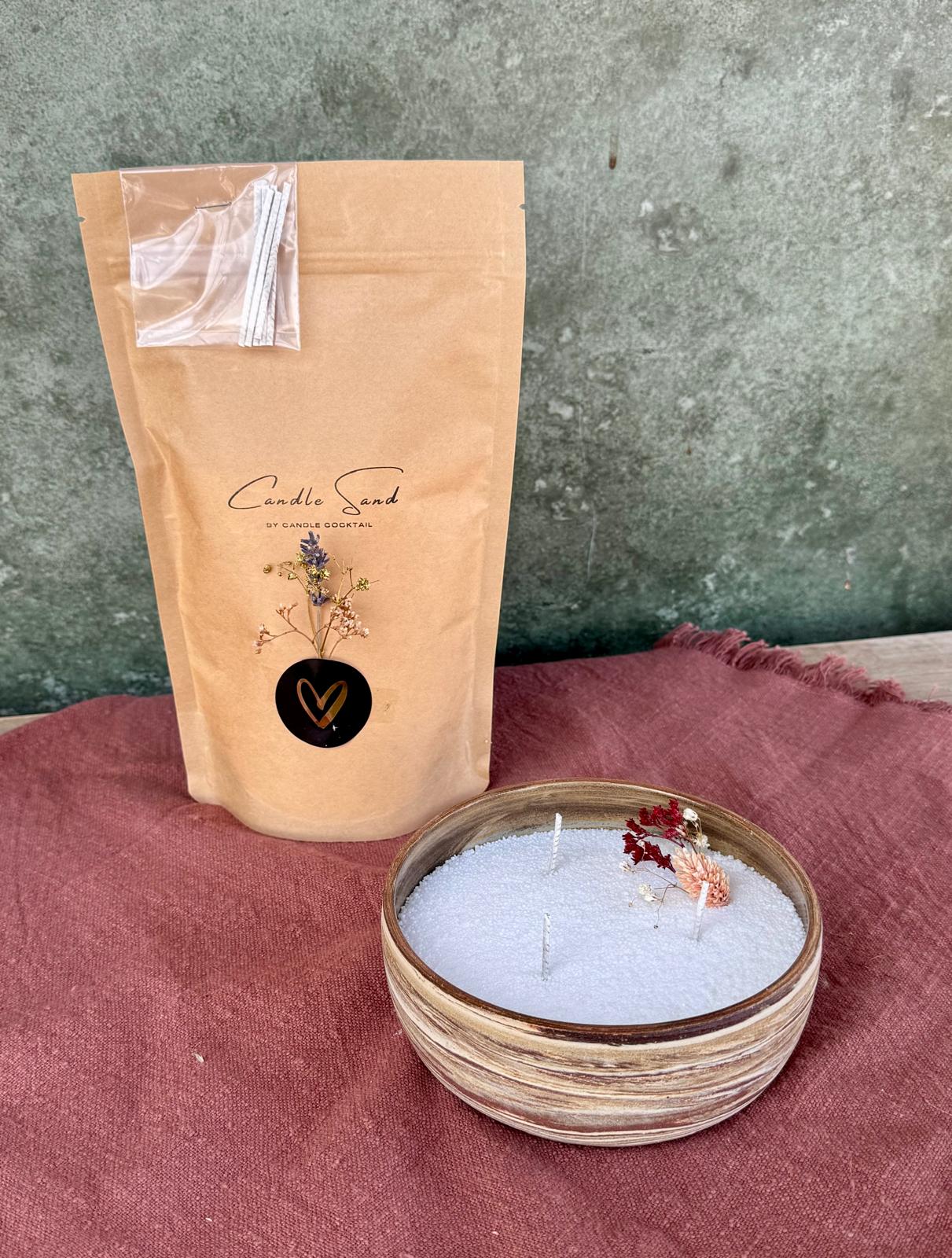 Hier wordt de kaarsenkom en het zand met wieken ed samen verkocht als leuk en origineel DIY-pakket.