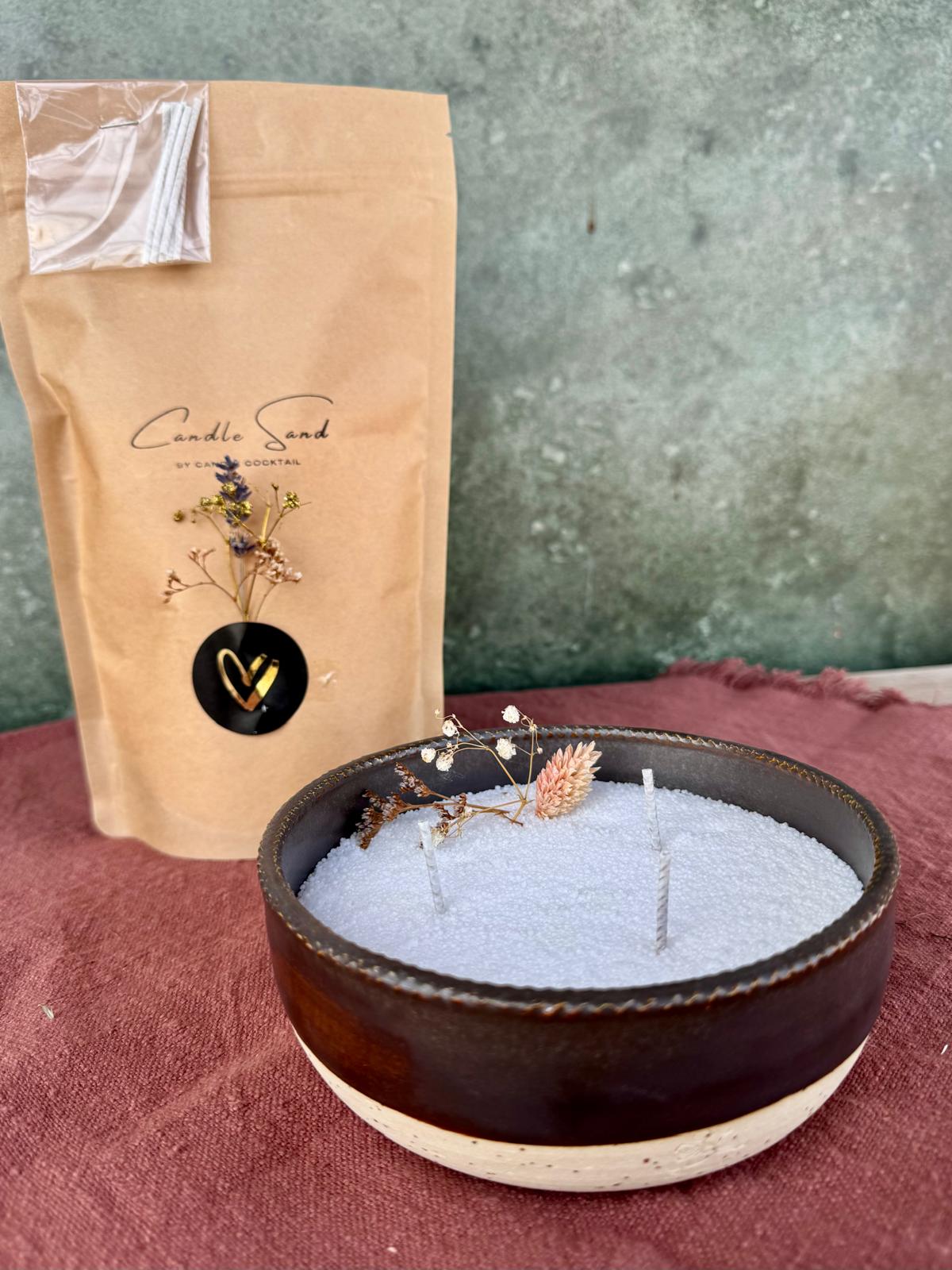 Hier wordt de kaarsenkom en het zand met wieken ed samen verkocht als leuk en origineel DIY-pakket.