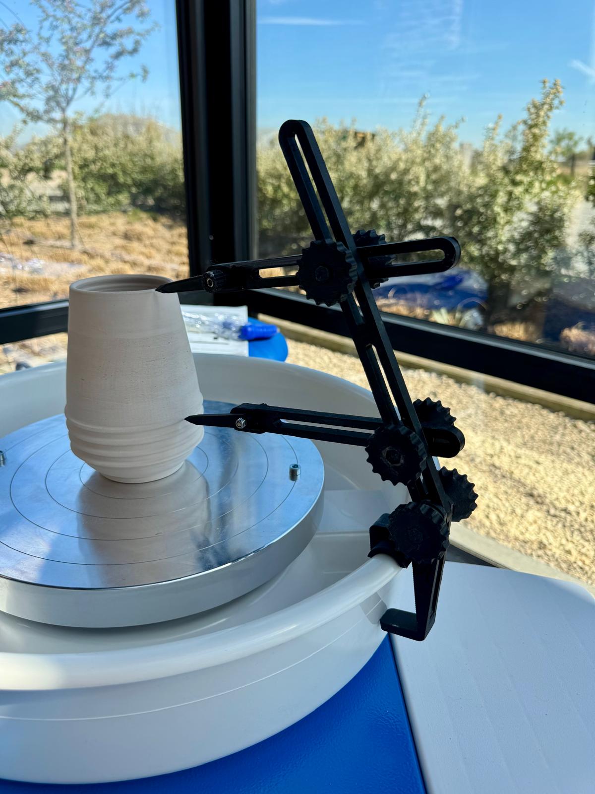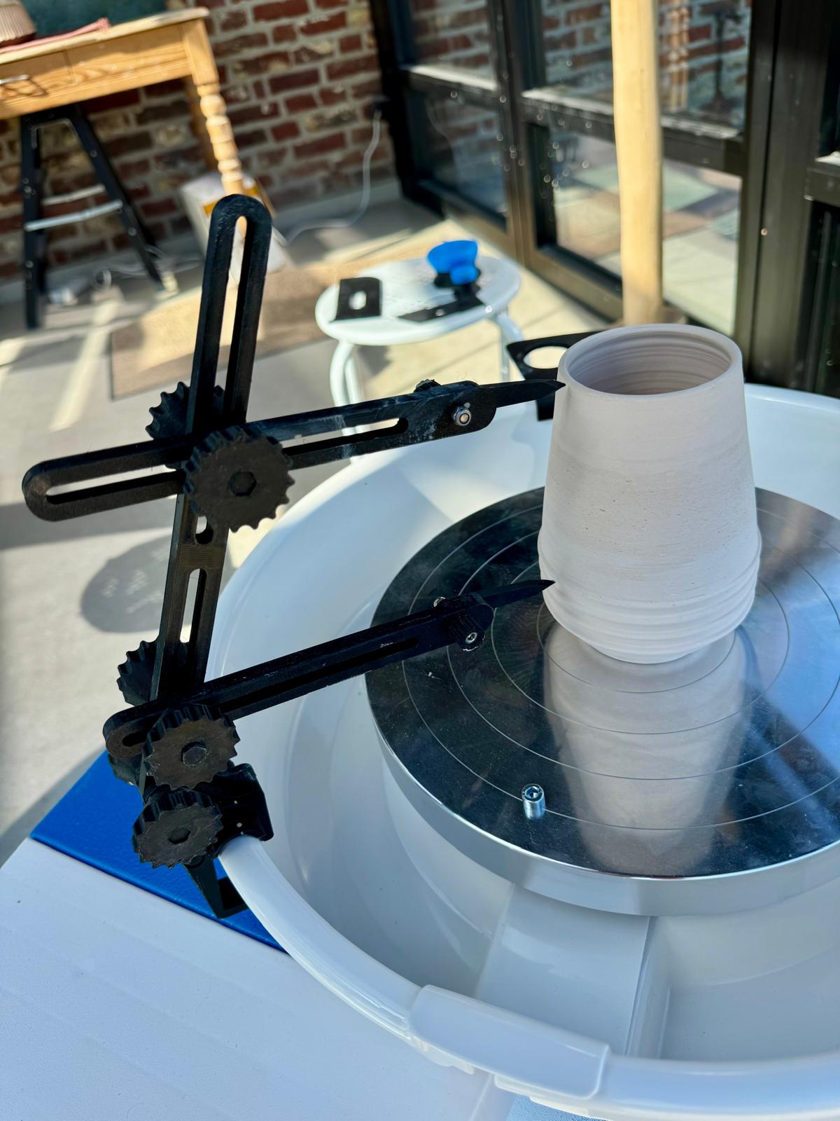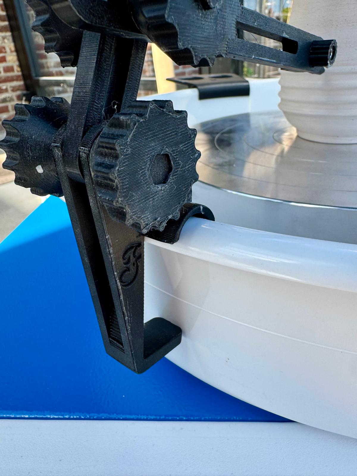 De meetstaaf is makkelijk te klikken op je draaibak zelf waardoor je geen ruimte verliest en ook wint aan stabiliteit, ze bevat 2 armen als meetpunt EN telkens een naar boven klikbaar uiteinde waardoor je niet gestoord wordt in je handbewegingen tijdens het draaien. De meetpunten zijn ook scherp waardoor deze meteen ook als naaldje kunnen dienen wanneer je vorm te hoog is... ook hier zorgden we opnieuw voor grote draaiknoppen waardoor afstellen van hoogte niet langer een frustratiepunt is.