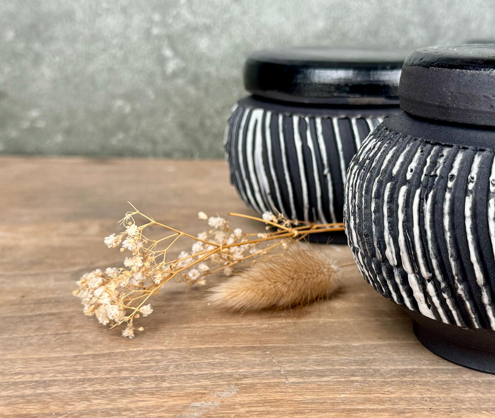 Discrete, stoer-elegante mini-urne gemaakt uit zwarte klei en porseleinslib.