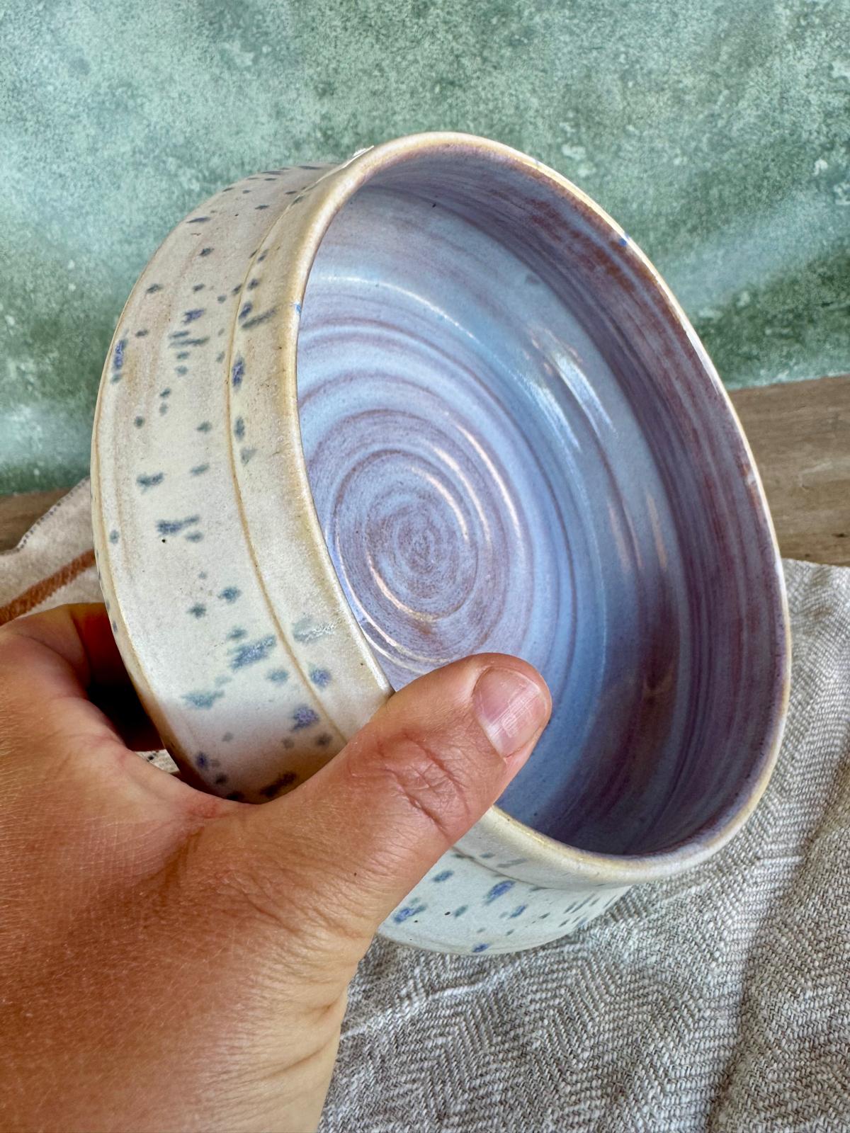 Strakke vorm met buitenkant mat wit glazuur met paarse stipjes. Binnenkant zacht romig lavendelglazuur.