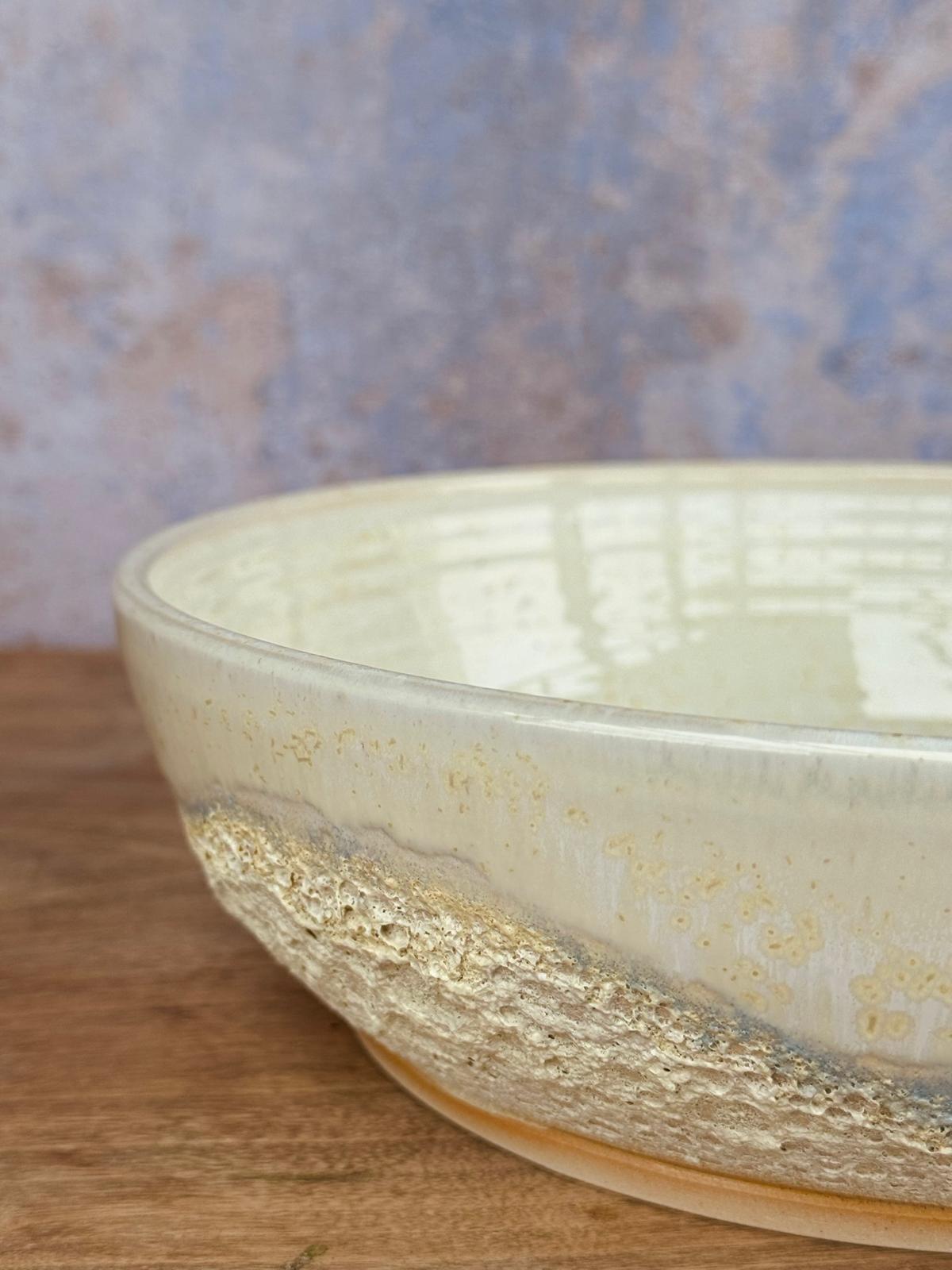 Binnenkant en rand in heel zacht ecru met kleine spetters.