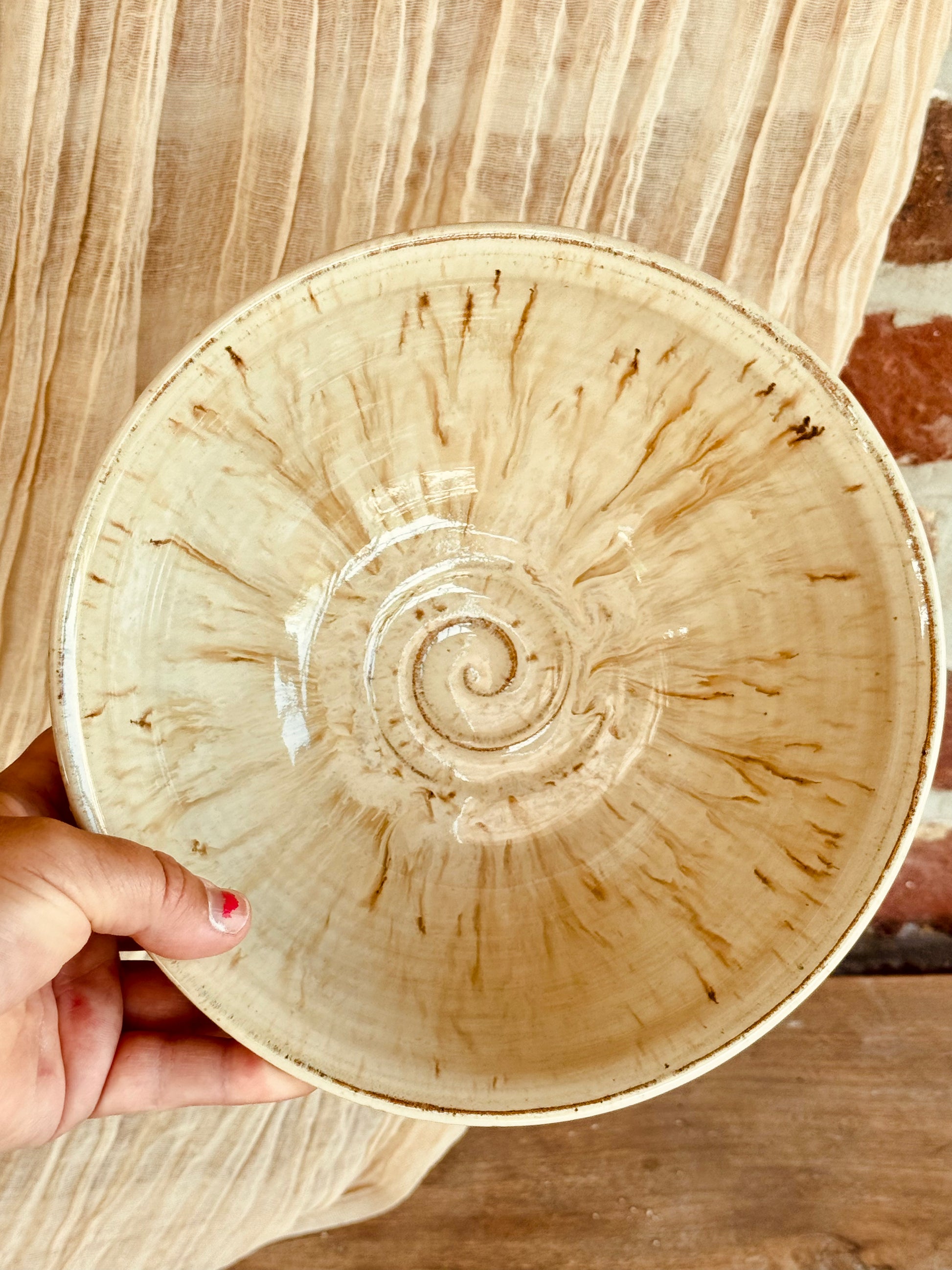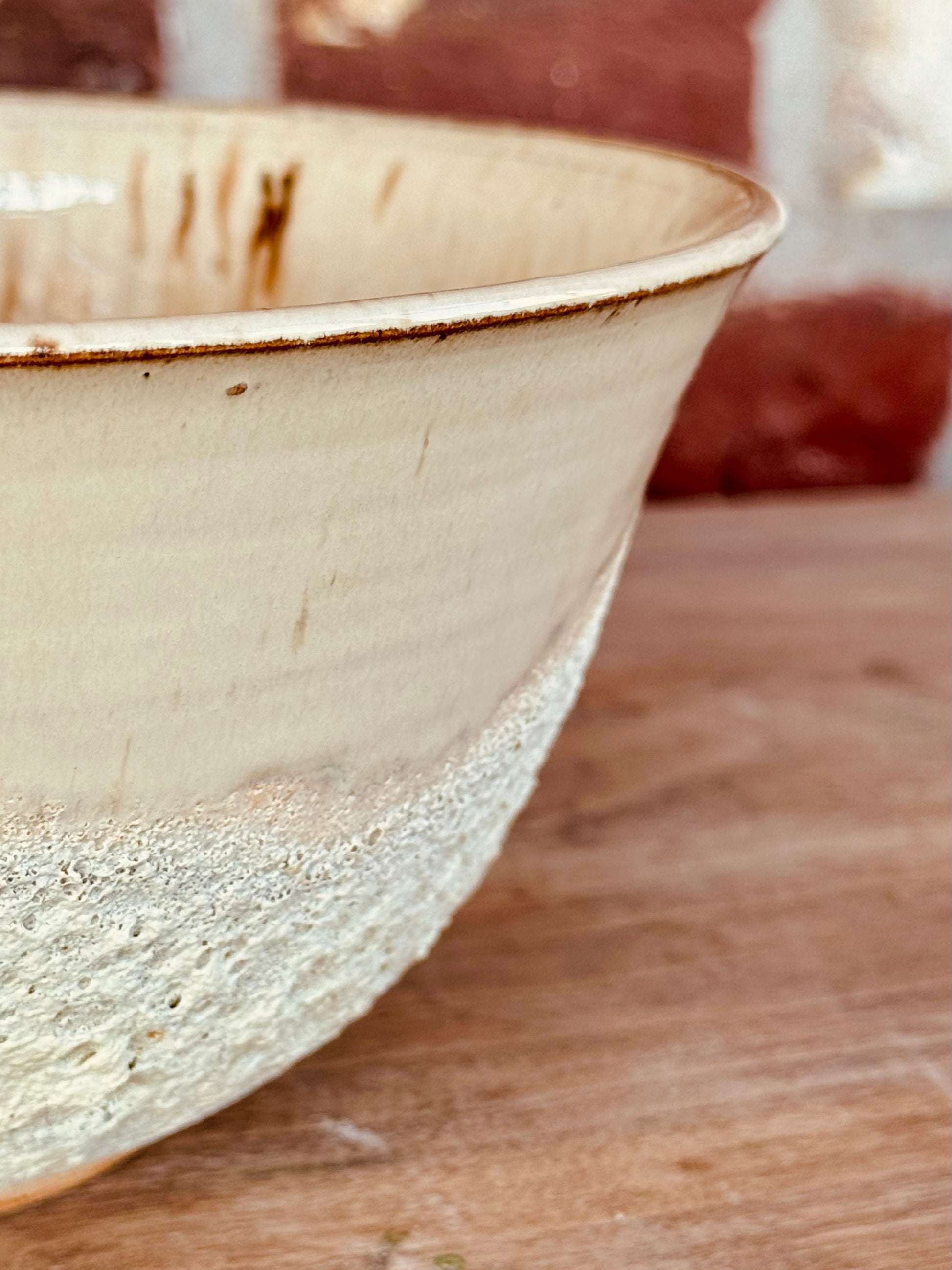 buitenkant golvend rotsachtig glazuur met bovenaan en binnenin een levendig & warm ecru glazuur.
