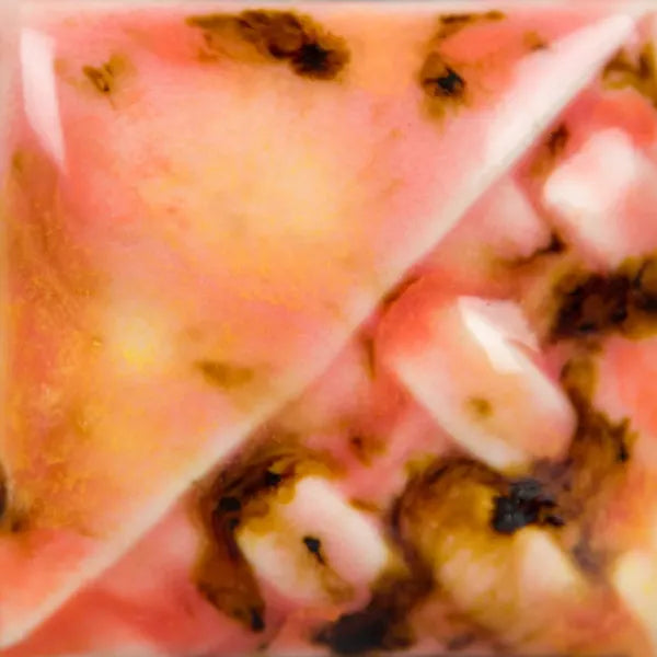 Amaryllis is een glanzend, transparant, koraalglazuur met kristallen in verschillende groottes die uitbloeien in tinten bruin, geel en oranje.