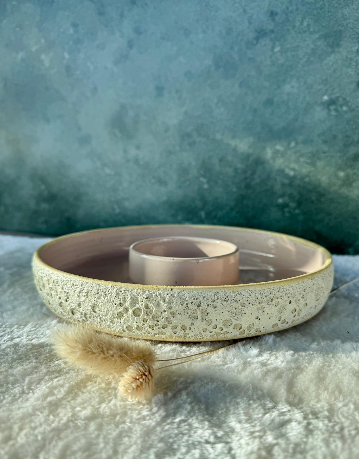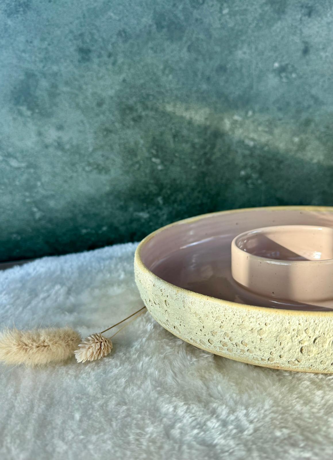 Binnenkant, rozig nude glazuur en buitenkant ecru rotsglazuur.
