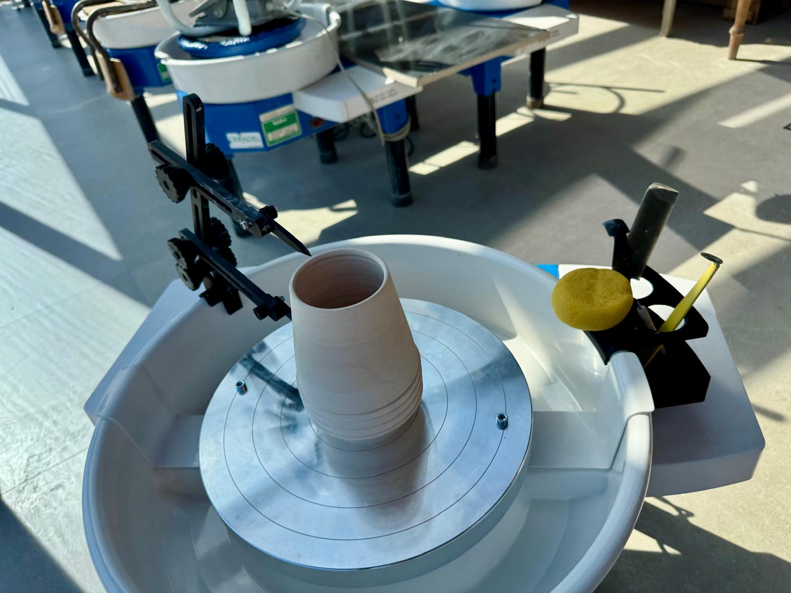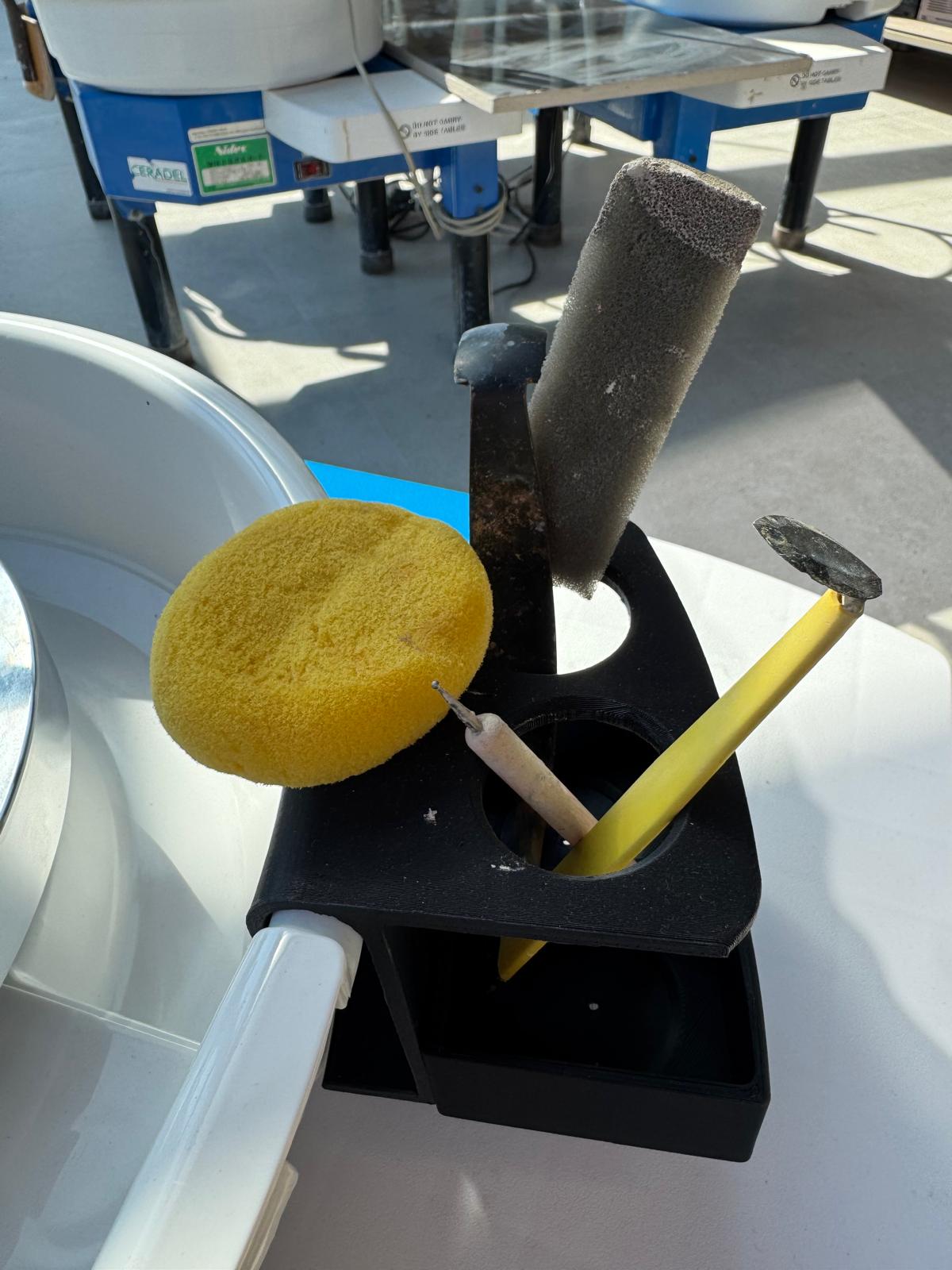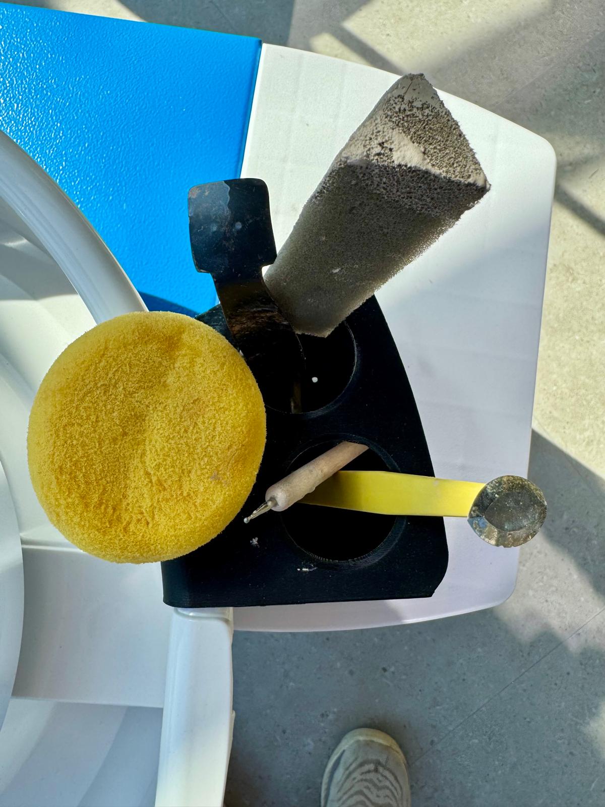 Deze handige gereedschapsbak houdt al je gereedschap keurig binnen handbereik. Daarom moet je nooit meer graaien en zoeken achter en onder je draaischijf, alles krijgt gemakkelijke plaats. We voltooien de bak met een tussenschot zodat de tools niet schuin kunnen vallen, wat bij andere wel altijd het geval was. Ook maakten we de toolhouder met een diepere bakje waardoor je tools er niet uitwippen als je wat wilder met je tools bent zoals ik ;) ook mede daarom voorzagen we de gaten van de houder ook wat groter zodat je niet moet vogelpikken met je tools ;)